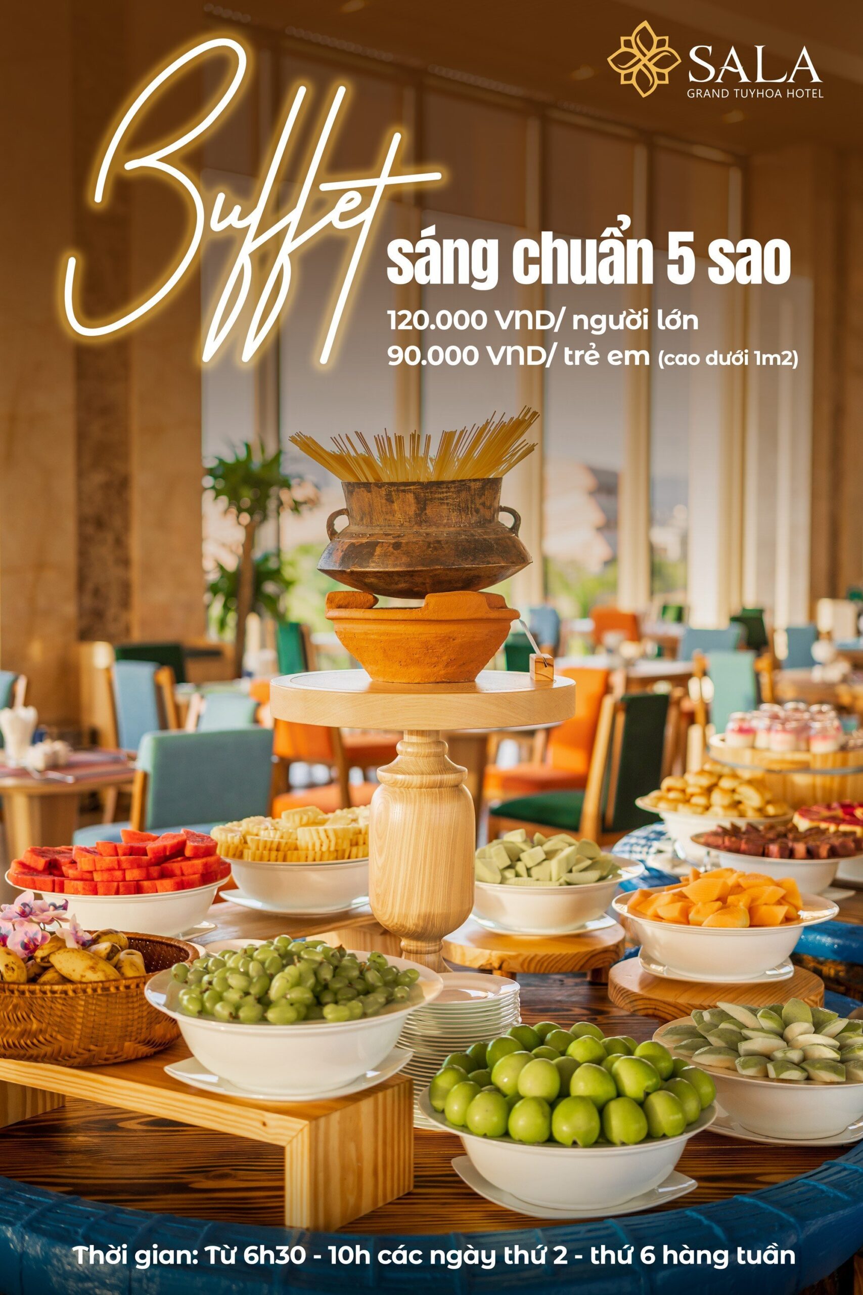 Đặc biệt, Sala Grand TuyHoa Hotel hiện đang có chương trình bán vé buffet sáng dành cho khách lưu trú bên ngoài với giá vé hấp dẫn: