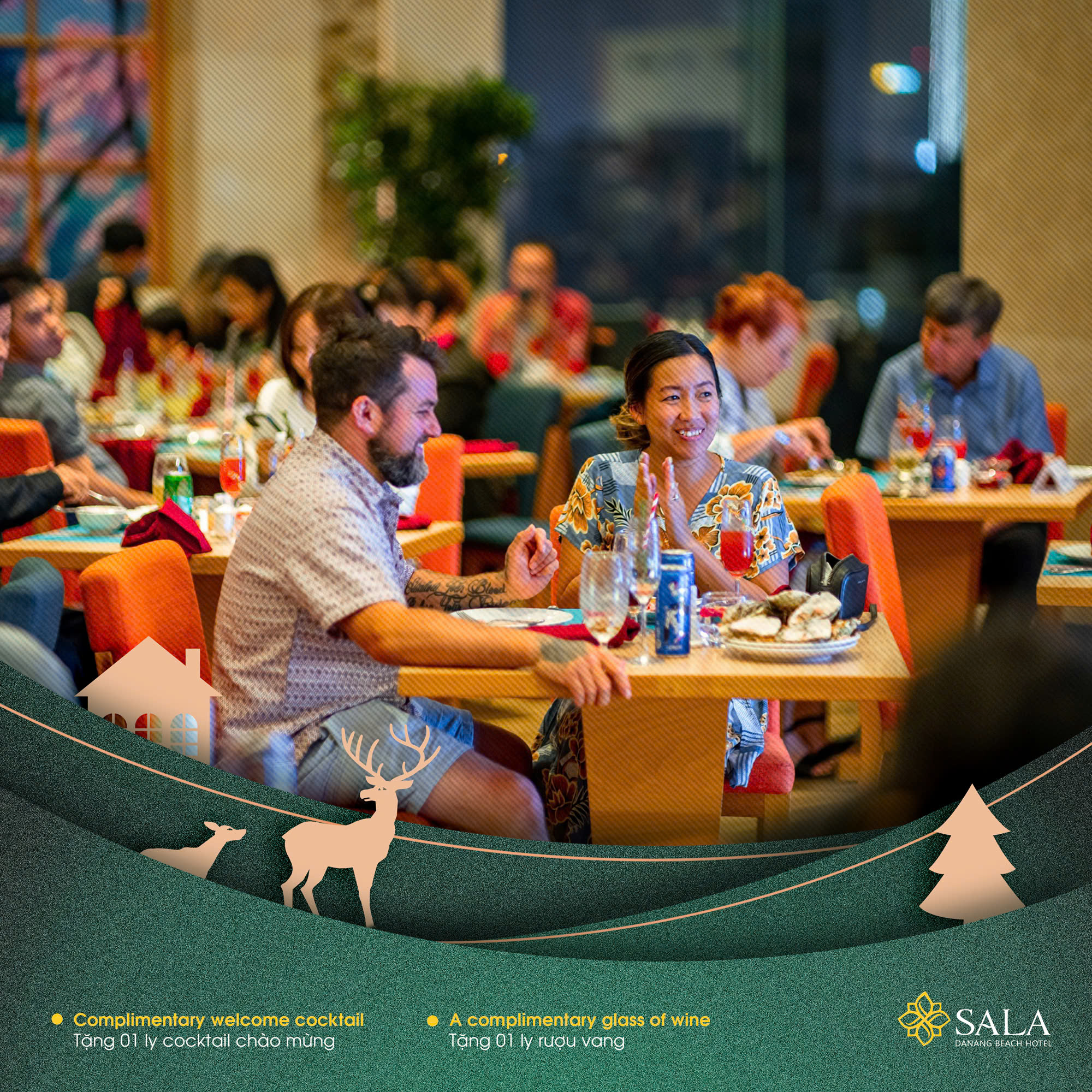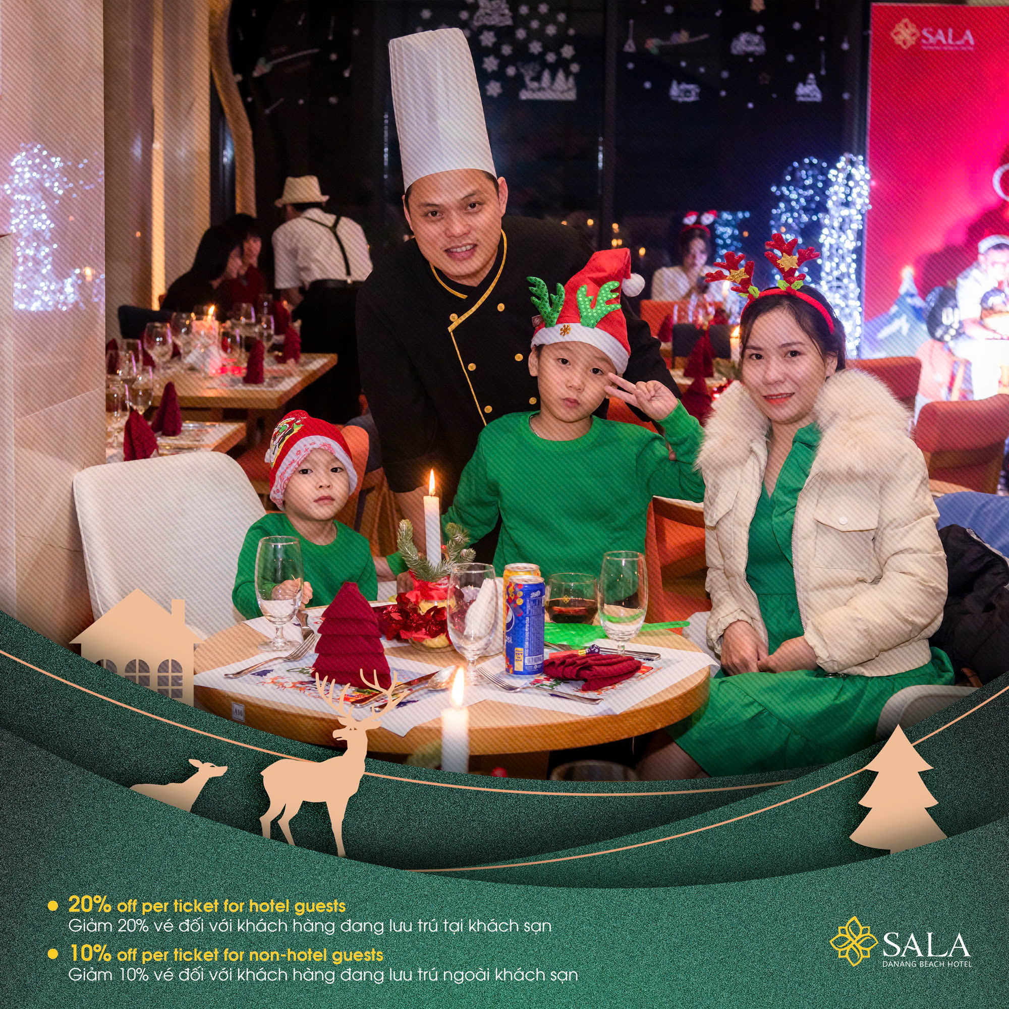 Tại Sala Danang Beach Hotel, bữa tiệc đêm Giáng Sinh đầy ý nghĩa đã sẵn sàng để phục vụ Quý khách. Bầu không khí ấm áp, không gian lung linh sắc màu, những món ăn thức uống ngon miệng, những giai điệu vui tươi – Tất cả sẽ đem đến cho Quý khách những trải nghiệm đáng nhớ cùng người thân yêu.
